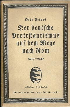 Petras, Otto: Der deutsche Protestantismus auf dem Wege nach Rom 1530-1930. 3.Auflage (6.-8.Tausend). Berlin: Widerstands-Verlag 1931. 8°. 51 Seiten. OBroschur. Der Rücken sauber durch Klebestreifen verstärkt. Ein sauberes Exemplar! Frakturschrift. (Mohler 467, B 210.2.15:) ‚Eigenbrötler mit genialen Zügen, von dem nur ein schmales Opus vorliegt.‘ Der Rücken und die Innengelenke durch Tesafilm verstärkt.