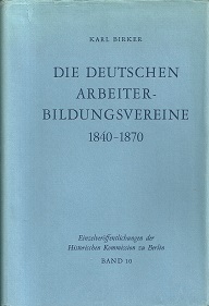 Birker, Karl: Die deutschen Arbeiterbildungsvereine 1840-1870. Mit einem Vorwort von Ernst Schaepler. Berlin: Colloquium Verlag 1973. 8°. XI, 239 Seiten. OLeinen mit Schutzumschlag. Der Schutzumschlag mit Gebrauchsspuren, sonst ein sauberes Exemplar! (Einzelveröffentlichungen der Historischen Kommission zu Berlin. 10)
