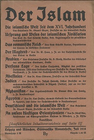 Der Islam. [Mit Beiträgen u.a. von: Eduard Meyer, Schekib Arslan, Bernhard Moritz, Hassan Taqizadeh, Enno Littmann, Joseph Horovitz, Otto von Hentig und Adolf Dirr.] Leipzig, München: Süddeutsche Monatshefte 1918. 8°. VIII, S. 222-300., IX-XVI [Werbung]. OBroschur. Der Umschlag etwas angestaubt, der Rücken etwas eingerissen. Frakturschrift. (Süddeutsche Monatshefte. 15.10) Neben allgemeinen und geschichtlichen Einführungen behandeln die Beiträge das osmanische Reich (Türkei), den Maghreb, Arabien, Persien, Abessinien, Indien, Afghanistan und Ägypten. Zwei der Beiträge von Eduard Meyer.