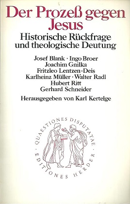 Kertelge, Karl (Hrsg.) Der Prozess gegen Jesus. Historische Rückfrage und theologische Deutung. Josef Blank, Ingo Broer,Joachim Gnilka [u.a.]. 2. Auflage. Freiburg, Basel, Wien: Herder 1989. 8°. 236 Seiten. OBroschur. Das Papier mit Lagerkellergeruch, sonst ein sauberes Exemplar. (Quaestiones disputatae. 112)