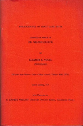 Vogel, Eleanor K.: Bibliography of Holy Land Sites. Compiled in honor of Dr. Nelson Glueck. Off-print from Hebrew Union College Annual, Volume XLII (1971). With Foreword by G. Ernest Wright. 2. Auflage. O.O.: Hebrew Union College-Jewish Institute of Religion 1974. 8°. 96 Seiten. OBroschur. Ein sauberes Exemplar!