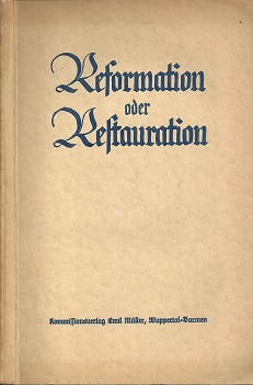 Immer, Karl (Hrsg.) Reformation oder Restauration. Vorträge auf einer Richtwoche der Bekennenden Kirche in Deutschland. Wuppertal-Barmen: E. Müller 1935. 8°. 78 Seiten. OBroschur. Ein Namenszug auf dem Titelblatt und vereinzelte Bleistiftmarginalien im Text. Frakturschrift. (Diehn. Kirchenkampf, 3601)