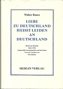 Bauer, Walter: Liebe zu Deutschland heisst leiden an Deutschland. Briefe aus Kanada 1962-1976. Ausgewählt, hrsgg. und mit einem Vorwort versehen von Otto Röders. Gifkendorf: Merlin Verlag 1983. Groß-8° (24x16,5cm). 479 Seiten. OLeinen mit Schutzumschlag. Ein sauberes Exemplar!