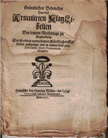 [Schwartzkopff, Johann:] Gründliches Bedencken Von den Articulirten Klag-Libellen Bey letztem Reichstage zu Regensburg Durch einen vornehmen Fürstlichen Gesanten auffgesetzet und in namen dern zum Justitzwesen Herrn Deputatorum übergeben. Helmstadt, bey Henning Müller, der Julius Vniversität bestalten Buchdrucker, 1657. 4“. 16 nn. Blatt. Gefaltete Bögen ohne Umschlag. Ein teilweise unaufgeschnittenes Exemplar. Die SAeiten durchgehend braunrandig, die letzten drei Seiten im Heftungsbereichmit kleinem Einriss, jedoch ohne Textverlust. Auch die ersten beiden Blätter mit kleinen Fehlstellen um den Bugbereich. Überwiegend Frakturschrift. Auf dem Regensburger Reichstag von 1653/54 trat Schwartzkopff (1596-1658) als Führer der niedersächsischen Fürstenpartei gegen den kaiserlichen Dominat, gegen die kurfürstliche Praeeminenz und gegen die Umtriebe der katholischen Heißsporne ins Feld, entriß durch die Verständigung mit Brandenburg dem Kaiser den fast schon errungenen Sieg und rettete so die evangelische Libertät.