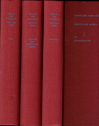 Günderrode, Karoline von: Sämtliche Werke und ausgewählte Studien. Historisch-kritische Ausgabe. Herausgegeben von Walter Morgenthaler. Band 1: Texte. Band 2: Varianten und ausgewählte Studien. Band 3: Kommentar. Basel, Frankfurt: Stroemfeld / Roter Stern 1990-1991. Groß-8° (24,5x16cm). 487 Seiten; 494 Seiten; 437 Seiten. OLeinen. Saubere Exemplare.