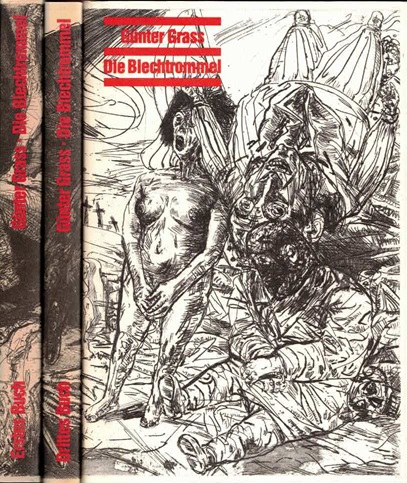 Grass, Günter: [Signiert!] Die Blechtrommel. Mit [37] Radierungen von Hubertus Griebe. Einmalige, limitierte und numerierte Sonderausgabe. Band 1-3. Berlin: Verlag Volk und Welt 1991. Groß-8° (24,5x16cm). 206 Seiten, 13 Illustrationen; 242 Seiten, 12 Illustrationen. 174 Seiten, 12 Illustrationen. OLeinen mit illustrierten Schutzumschlägen und Schuber. Das Bezugspapier des Schubers an zwei Stellen abgerieben. Saubere Exemplare! Exemplar Nr. 407 einer auf 1500 Stück limitierten und numerierten Ausgabe. Das Titelblatt des ersten Bandes von Grass signiert! Aufwändig bibliofiel gestaltete Ausgabe mit Text in Schwarz-Rot-Druck und teilweise gefalteten Radierungen.