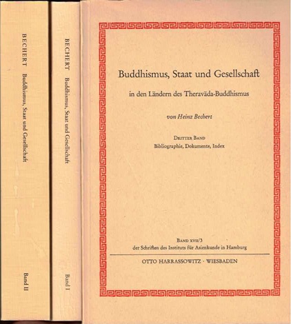 Bechert, Heinz. Buddhismus, Staat und Gesellschaft in den Ländern des Theravada-Buddhismus. Band 1: Grundlagen. Ceylon (Sri Lanka). Band 2: Birma, Kambodscha, Laos, Thailand. Band 3: Bibliographie, Dokumente, Index. [Band 1:] Mit einem Register versehenerm unveränderter Nachdruck der Ausgabe von 1966. [Band 2:] Neuausgabe mit Supplementen sowie Personen- und Sachregister]. Band 1-3. Göttingen: Seminar für Indologie und Buddhismuskunde ([Band 3:] Wiesbaden: Harrassowitz). 1988, 2000 und 1973. 8°. XXI, 404 Seiten; XLIV, 461 Seiten; XVII, 662 Seiten. OBroschur. Saubere Exemplare! (Schriften des Instituts für Asienkunde in Hamburg. 17.1-3.) [Band 1 und 2 auch:] (Veröffentlichungen des Seminars für Indologie und Buddhismuskunde der Universität Göttingen. 5 und 8] Mischauflage des vollständigen Gesamtwerks. Band 1 und 2 als Neuausgabe, Band 3 in der Originalausgabe.