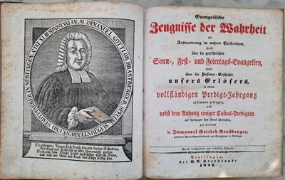 Brastberger, Immanuel Gottlob: Evangelische Zeugnisse der Wahrheit zur Aufmunterung im wahren Christenthum. Theils über die gewöhnlichen Sonn-, Fest- und Feiertags-Evangelien, theils über die Passions-Geschichte unsers Erlösers. in einem vollständigen Predigt-Jahrgang zusammen getragen, und nebst dem Anhang einiger Casual-Predigten auf Verlangen dem Druck überlassen. Neueste durchgesehene und verbesserte Ausgabe. Reutlingen: Heerbrandt 1842. 8° (22x19cm). 1 Holzschnitt-Porträt, XVI, 1096 Seiten., [4 Blatt] Register. Halbleder der Zeit. Der Rücken am oberen Rand auf etwa 1 cm eingerissen, der Einband und die Kanten berieben. Das vordere Vorsatzblatt fehlt. Abgesehen von einigen etwas stockfleckigen Seiten, ein sauberes Exemplar. Frakturschrift. (Realencyklopädie für protestantische Theologie³, 360; Mälzer, Die Werke der württembergischen Pietisten des 17. und 18. Jahrhunderts, 75,594). Der Lederrücken auf fünf echten Bünden.