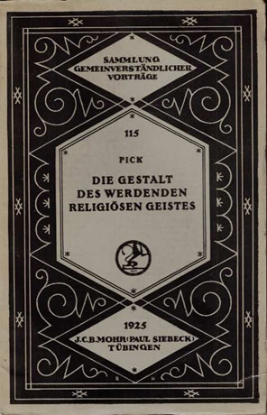 Pick, Georg: Die Gestalt des werdenden religiösen Geistes. Tübingen: Mohr 1925. 8°. 52 Seiten. OBroschur. Ein sauberes, unaufgeschnittenes Exemplar! (Sammlung gemeinverständlicher Vorträge und Schriften aus dem Gebiet der Theologie und Religionsgeschichte. 115)
